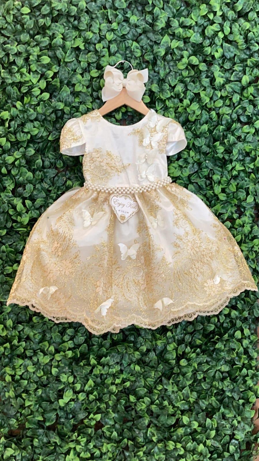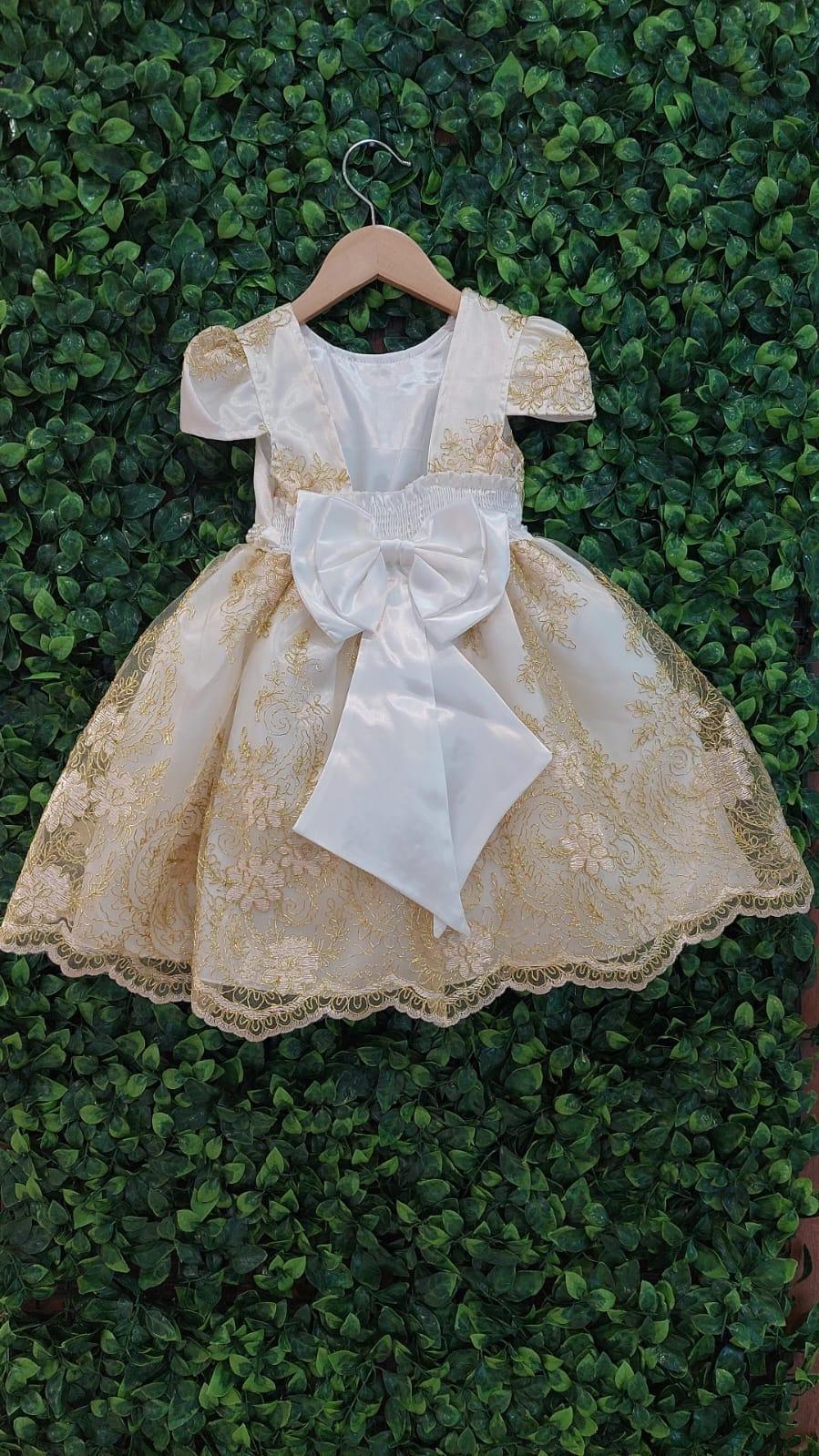 Vestido com manga, pérolas, brilhos e um lindo laço na parte de trás. Perfeito para sua princesa!