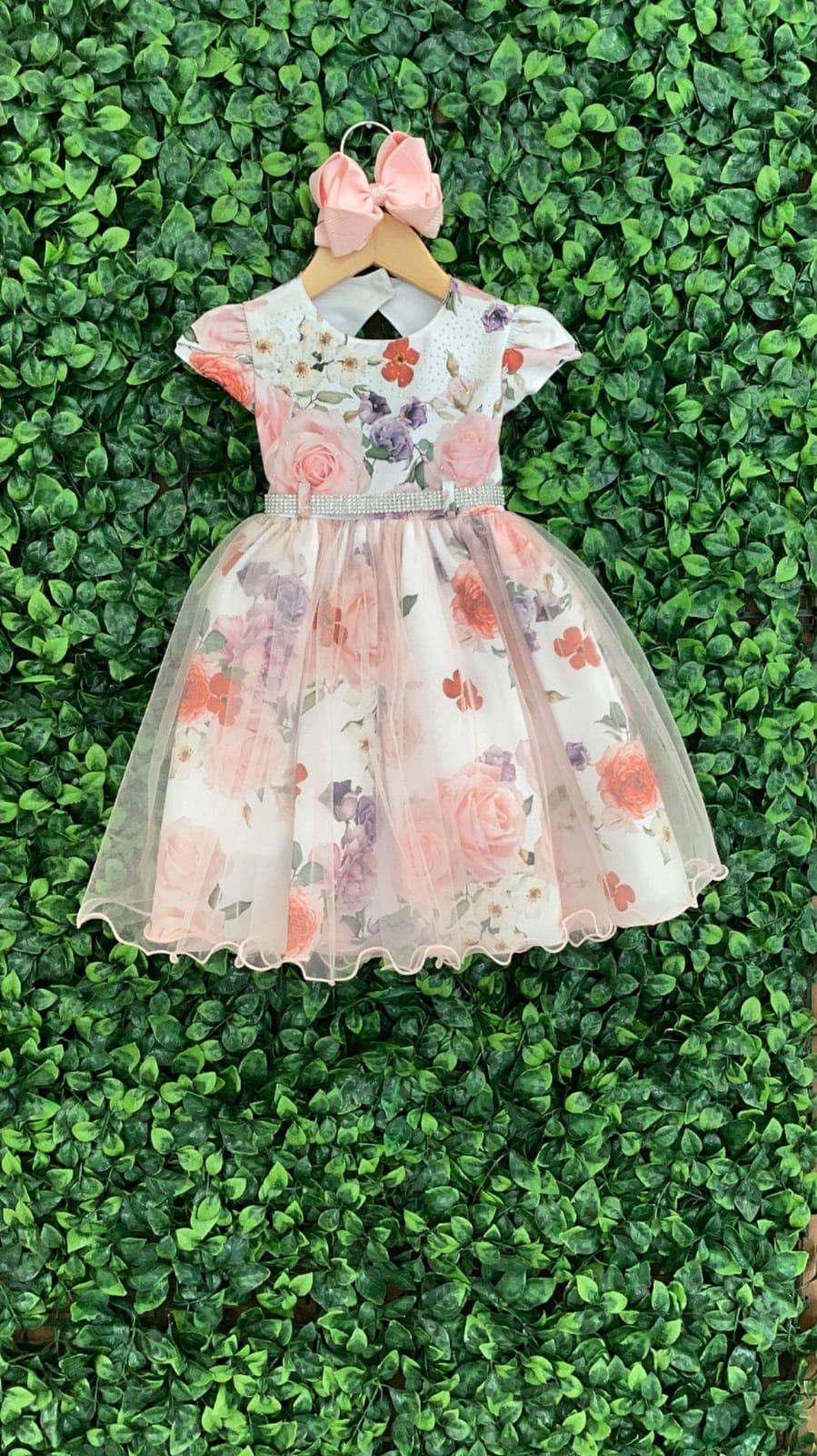 Esse vestido de flores é um encanto, com detalhes em brilho e uma fita de strass na cintura!