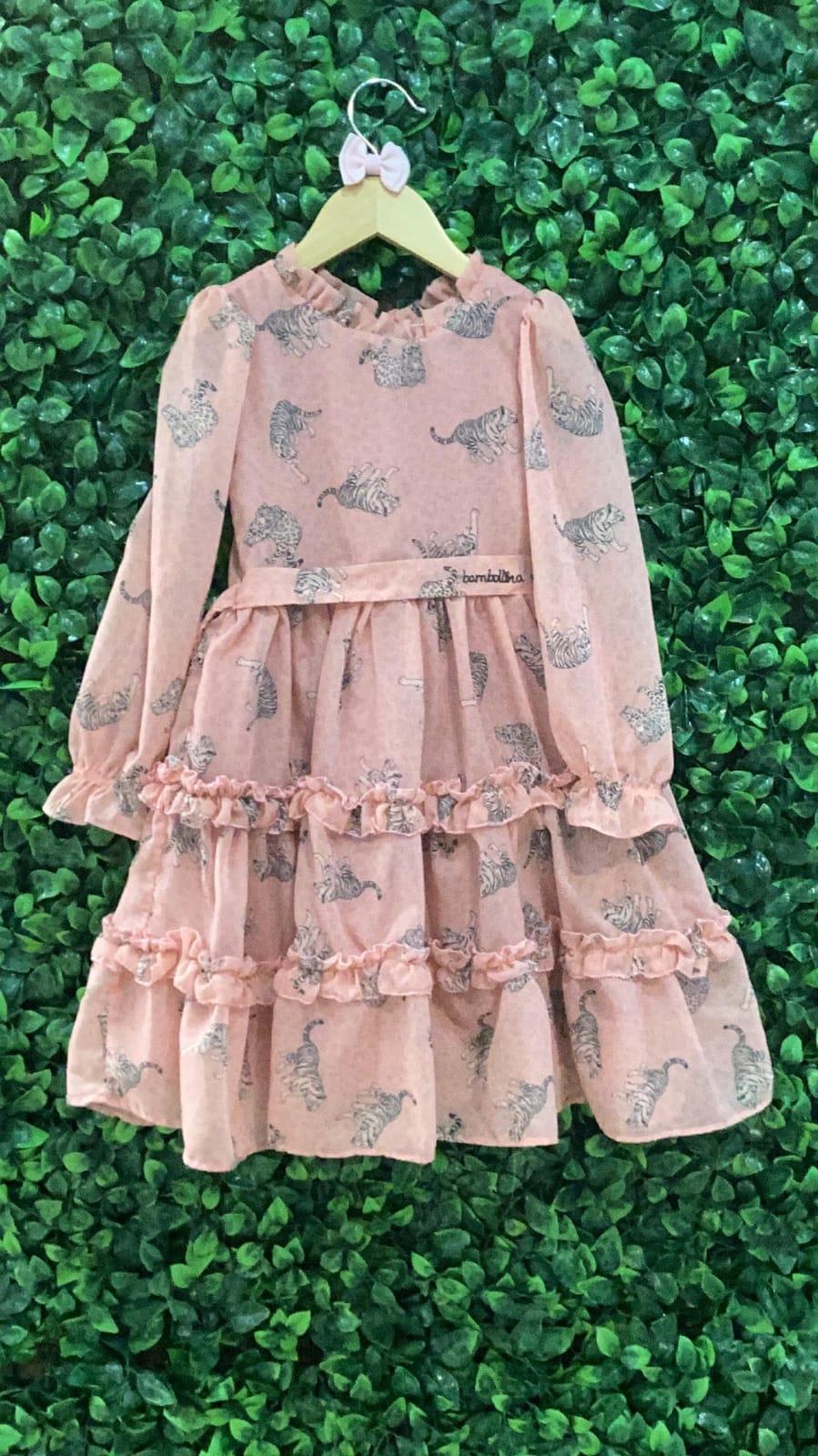 Vestido manga longa com estampas de tigres e babados. Perfeito para uma ocasião especial!