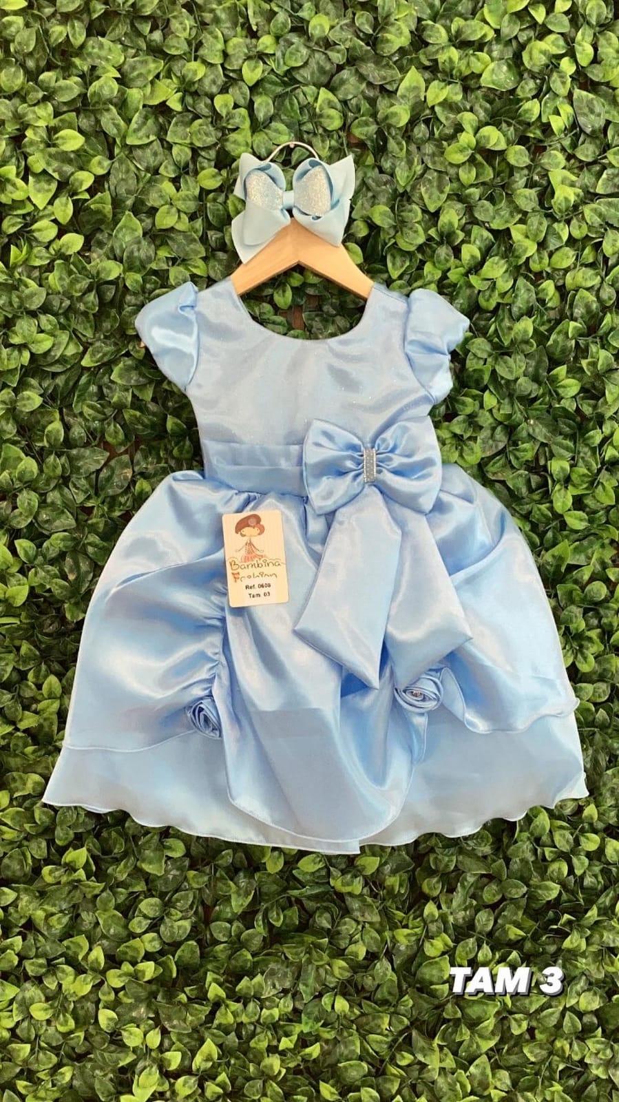 vestido de cetim azul com um lindo laço e nos babados flores delicadas!