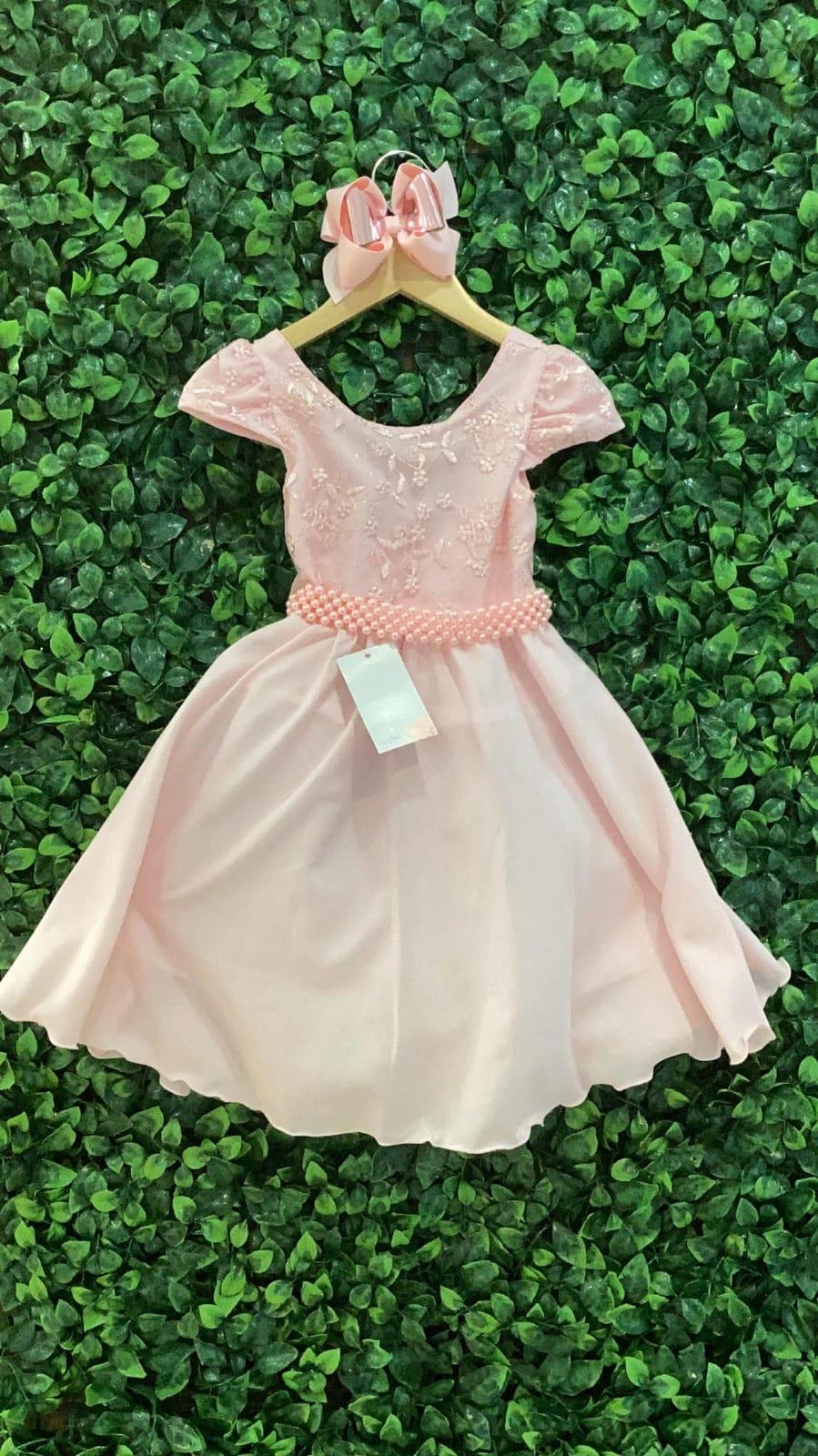 vestido rosa claro, com bordado e brilho na parte de cima. Na cintura um lindo cinto de pérolas.