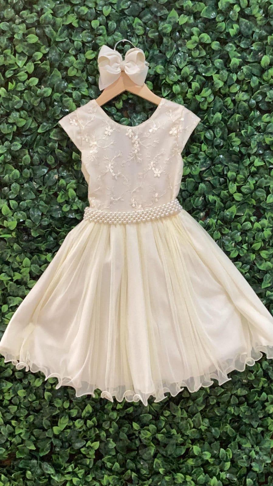 Um lindo vestido bege, bordado e com detalhes de pérolas na cintura!