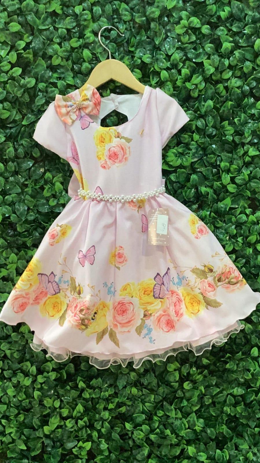 Um vestido super delicado com flores, borboletas e um cinto de pérolas. Acompanha um lindo laço para combinar.
