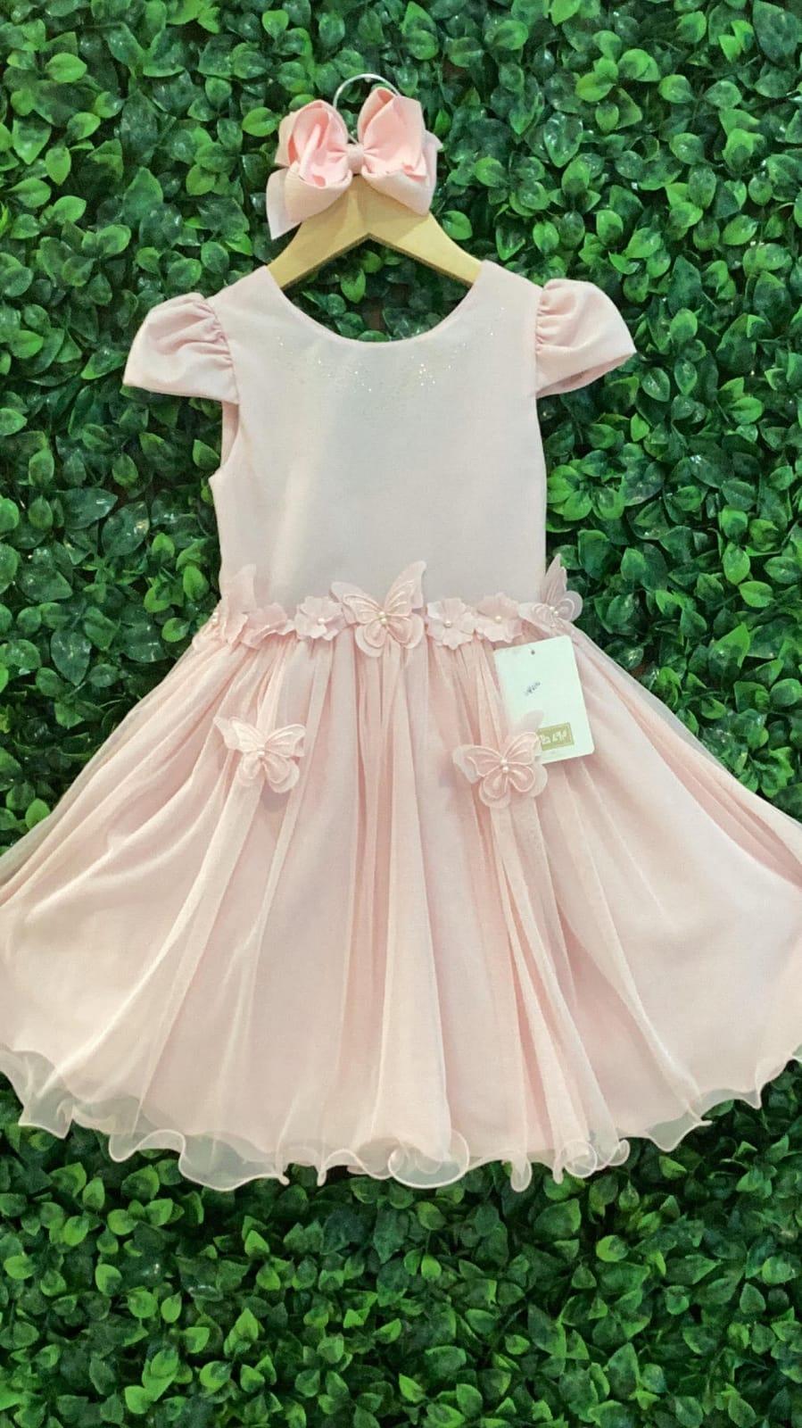 Esse lindo vestido rosa claro, com pontinhos de brilho, detalhes de borboletinhas e flores.