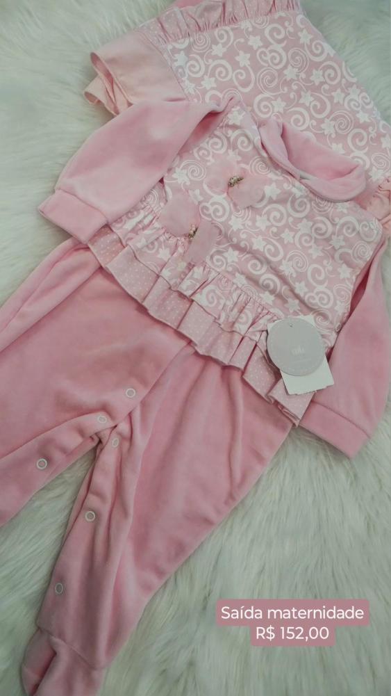 Saída maternidade rosa bebê de plush com estampa e laçinhos.