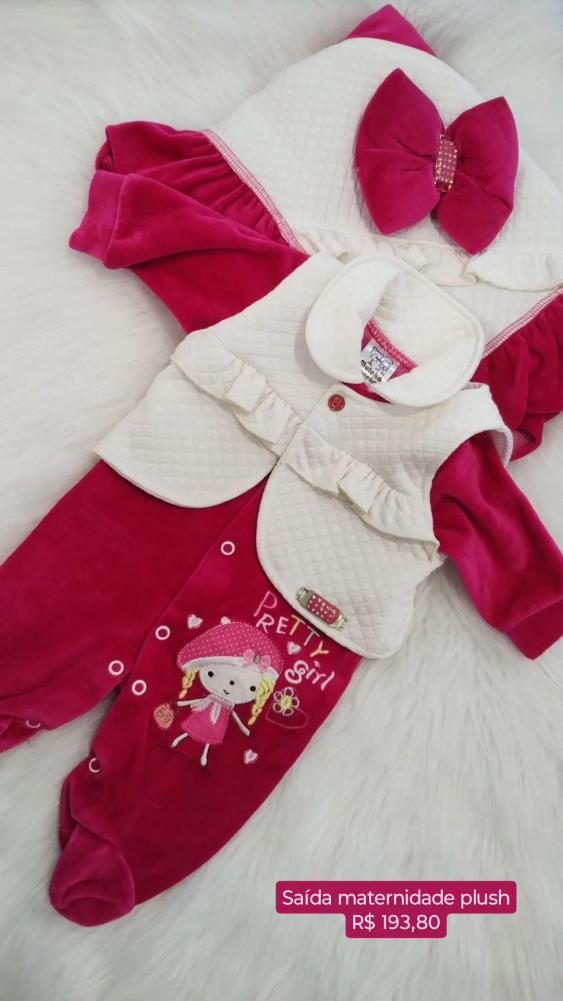 Saída maternidade rosa Pink, tecido plush, com detalhes em bordado e um colete fixado no macacão na cor off que deixa essa peça ainda mais bonita!