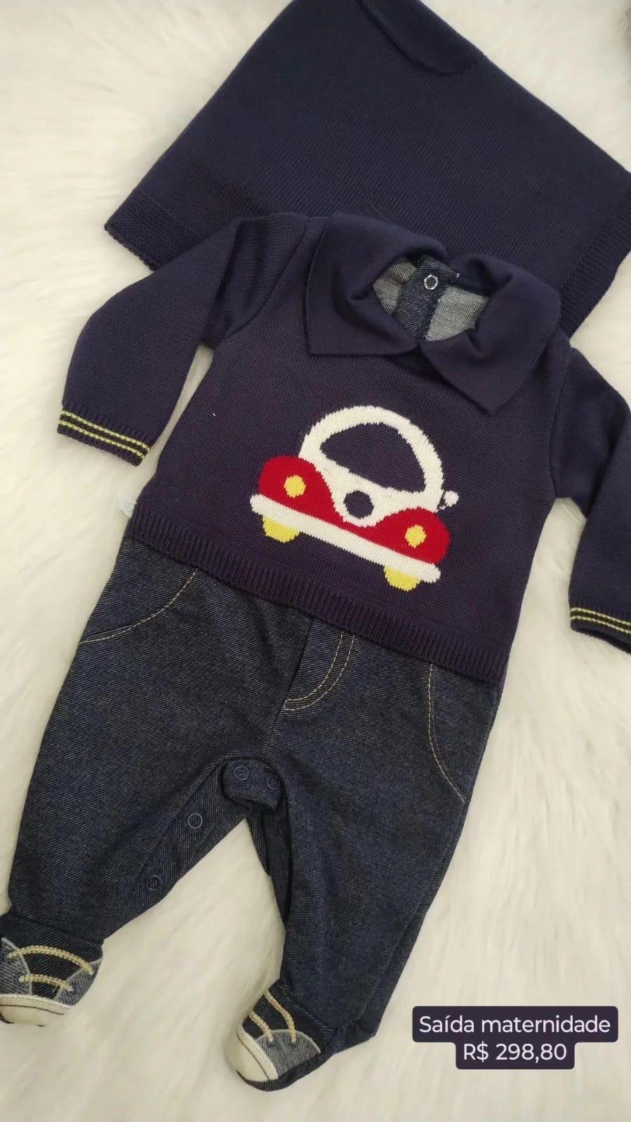 Saída maternidade azul com estampa de carrinho, na parte de baixo com estampa jeans e de tênis que deixa ainda mais fofo. Acompanha também uma linda manta.