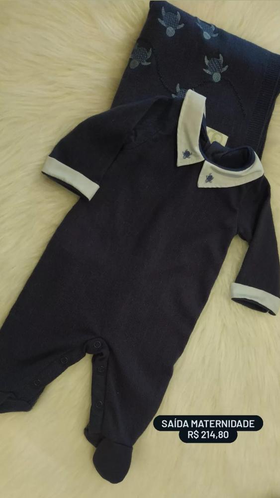 Saída maternidade azul marinho. Macacão azul com detalhe branco nas mangas e gola. A manta é bordada tartaruguinhas que deixa essa saída maternidade ainda mais linda.