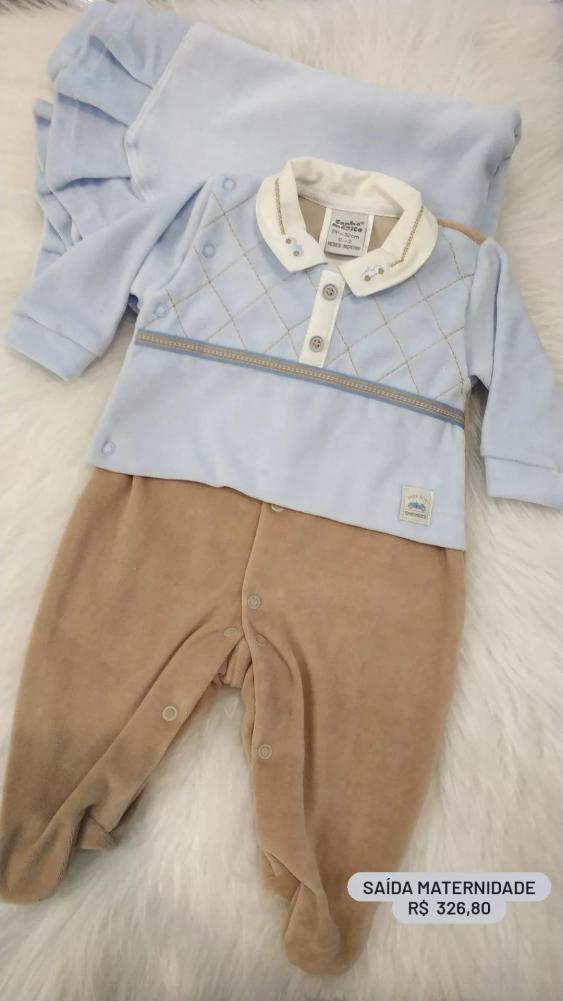 Saída maternidade azul bebê com marrom em tecido plush.