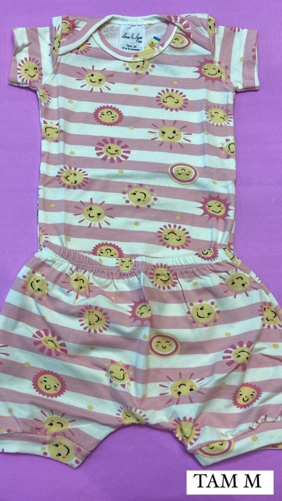 conjunto de body rosa com estampa de sol, lindo para o verão!